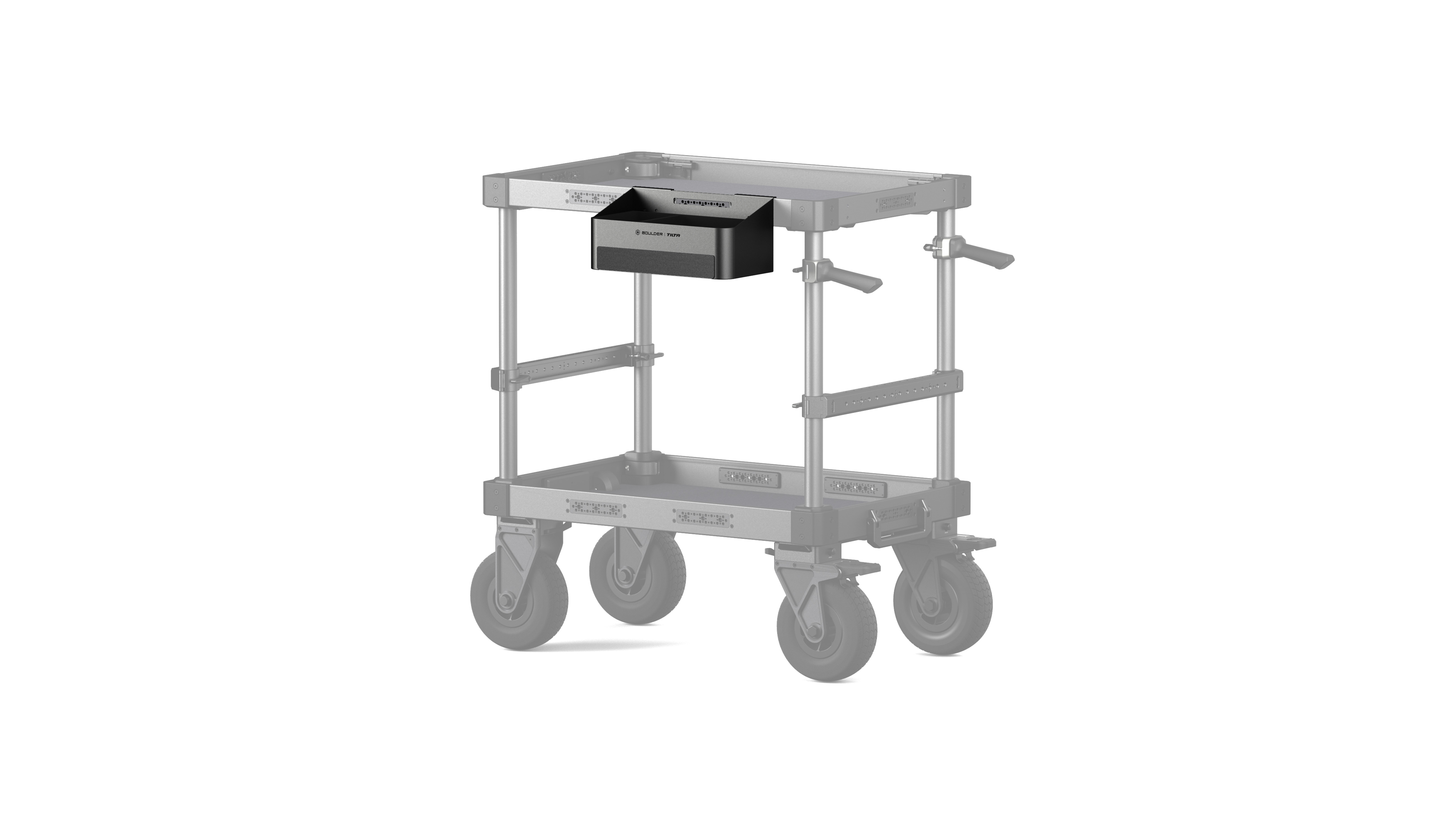 This compact yet practical bin attaches directly to the side of the Boulder Camera Cart’s tray, providing a dedicated storage space for small tools, accessories, and other frequently used items. Its dual-compartment design makes it easy to keep gear organized and separated, ensuring quick access during busy setups.